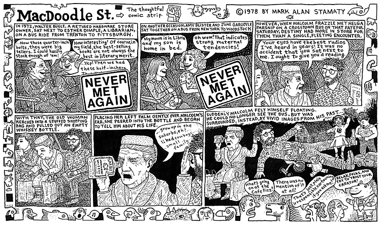 Every week, from 1978 to 1980, The Village Voice brought a new installment of Mark Alan Stamaty’s uproarious, endlessly inventive strip MacDoodle St. Centering more or less on Malcolm Frazzle, a blocked poet struggling to complete his latest lyric for Dishwasher Monthly, Stamaty’s creation encompassed a dizzying array of characters, stories, jokes, and digressions. One week might feature the ongoing battle between irate businessmen and bearded beatniks for control of a Greenwich Village coffee shop, the next might reveal a dastardly plot involving a genetically engineered dishwashing monkey, or the frustrated dreams of an irascible, over-caffeinated painter, or the mysterious visions of a duffle-coated soothsayer on the bus. Not to mention the variable moods and longings of the comic strip itself….